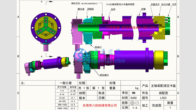 从图中可以看出液压卡盘的安装对比手动卡盘结构上有一些小区别,主要由集水盒、回转油缸、油缸法兰、拉杆、主轴、卡盘法兰、动力卡盘、卡爪等组成,同时外加装一个动力源液压站。